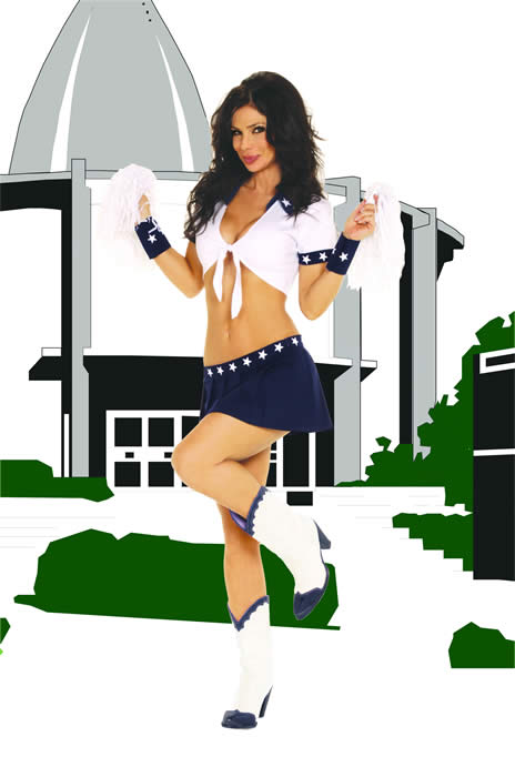 | 4 pc costume includes a short sleeve top, pleated mini skirt, wrist bands and pompoms. $63.00 |